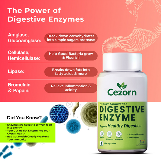 Cezorn Digestive Enzyme Capsules with Amylase, Protease, Glucoamylase | 60 Veg Capsules | Better Digestive Function, Healthy Gut & Health Management | For both Men & Women