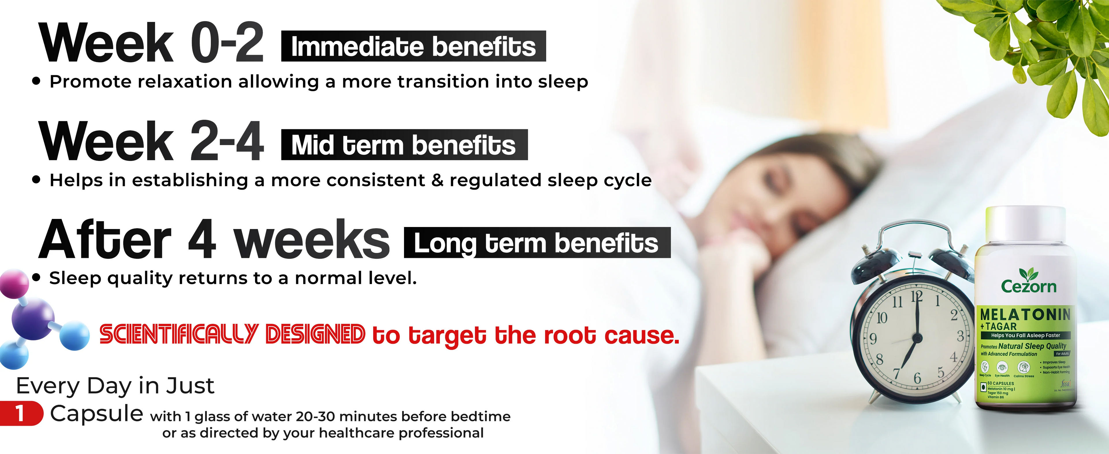 Cezorn Melatonin +Tagar Capsules will give you restful and relaxed sleep. It promotes a healthy sleep pattern. With all-natural ingredients, the product enhances your sleep quality and helps to control your sleep-wake cycle. These melatonin capsules are a blend of powerful antioxidants. It prevents cell damage and promotes healthy eyes as well.