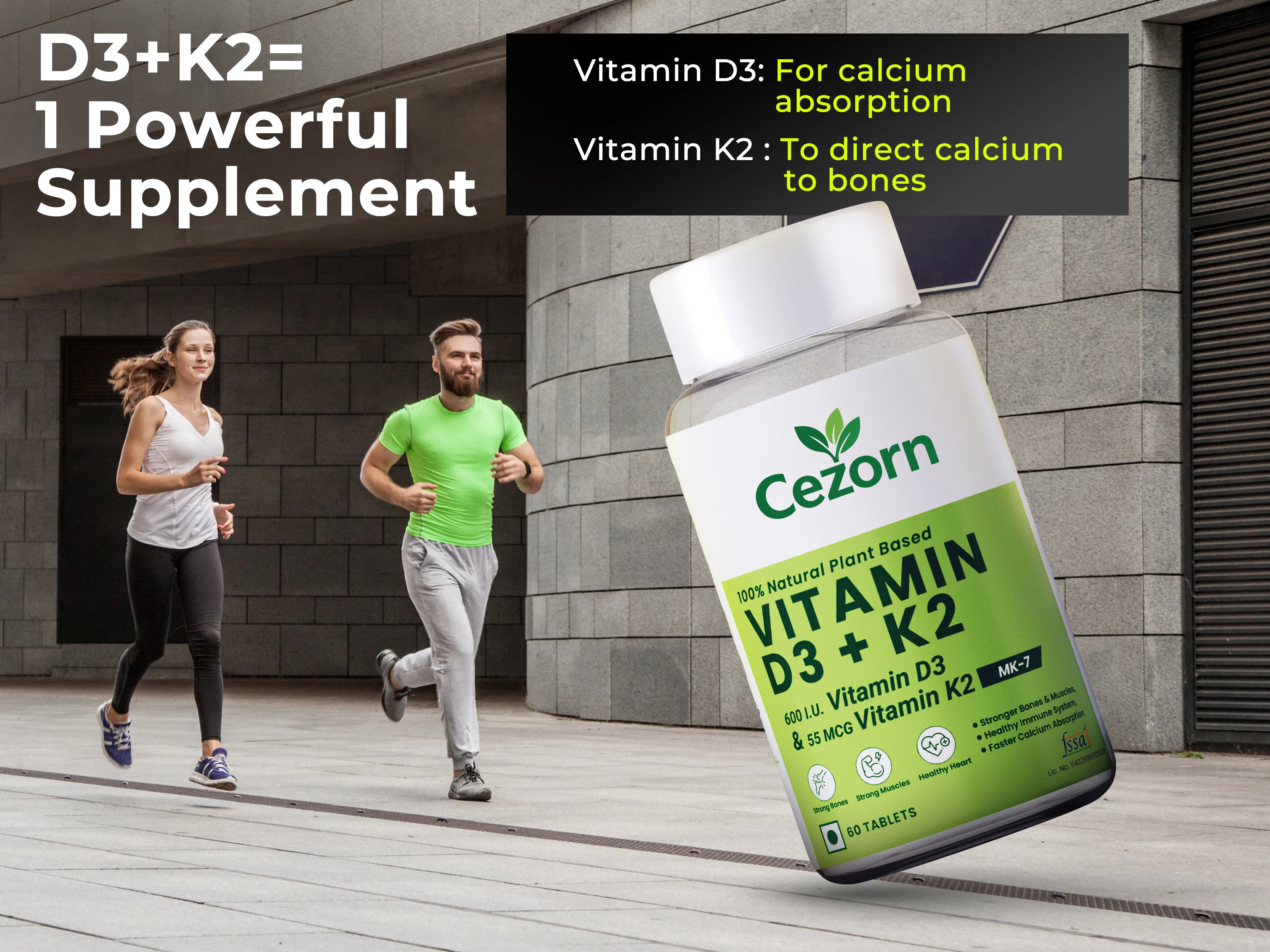 Cezorn Vitamin D3+K2 as MK7 Supplement | Support Healthy Bones & Boost Immune System & Joint Care | 60 Veg Tablets for both Men & Women