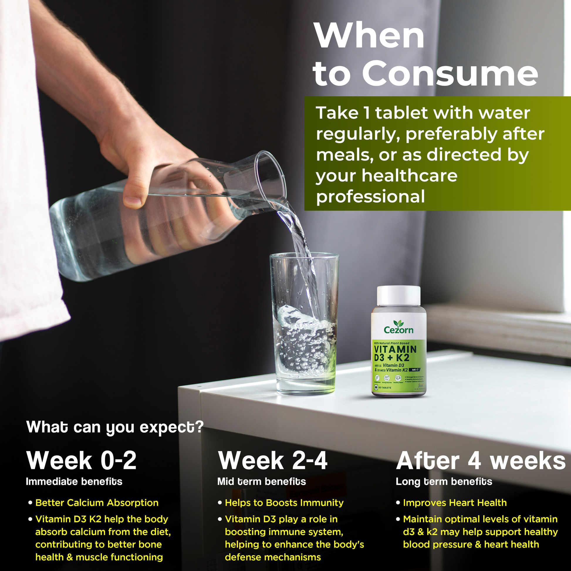 • ENHANCES IMMUNITY: Cezorn Vitamin D3 + K2 tablets perfectly blend both vitamins. It supports faster healing of wounds and manages free radicals. It also helps to enhance the innate immunological response and fight against invading pathogens.