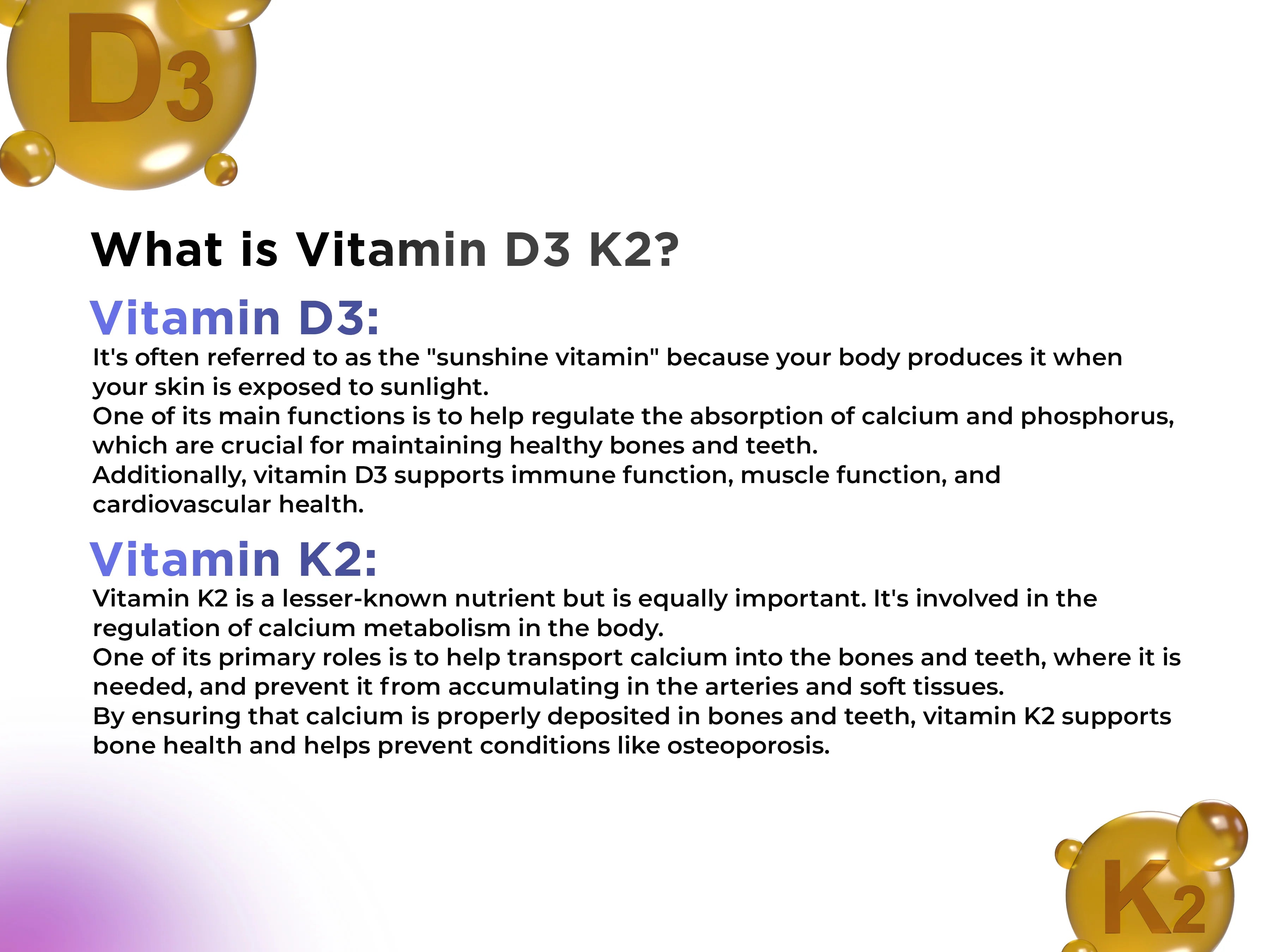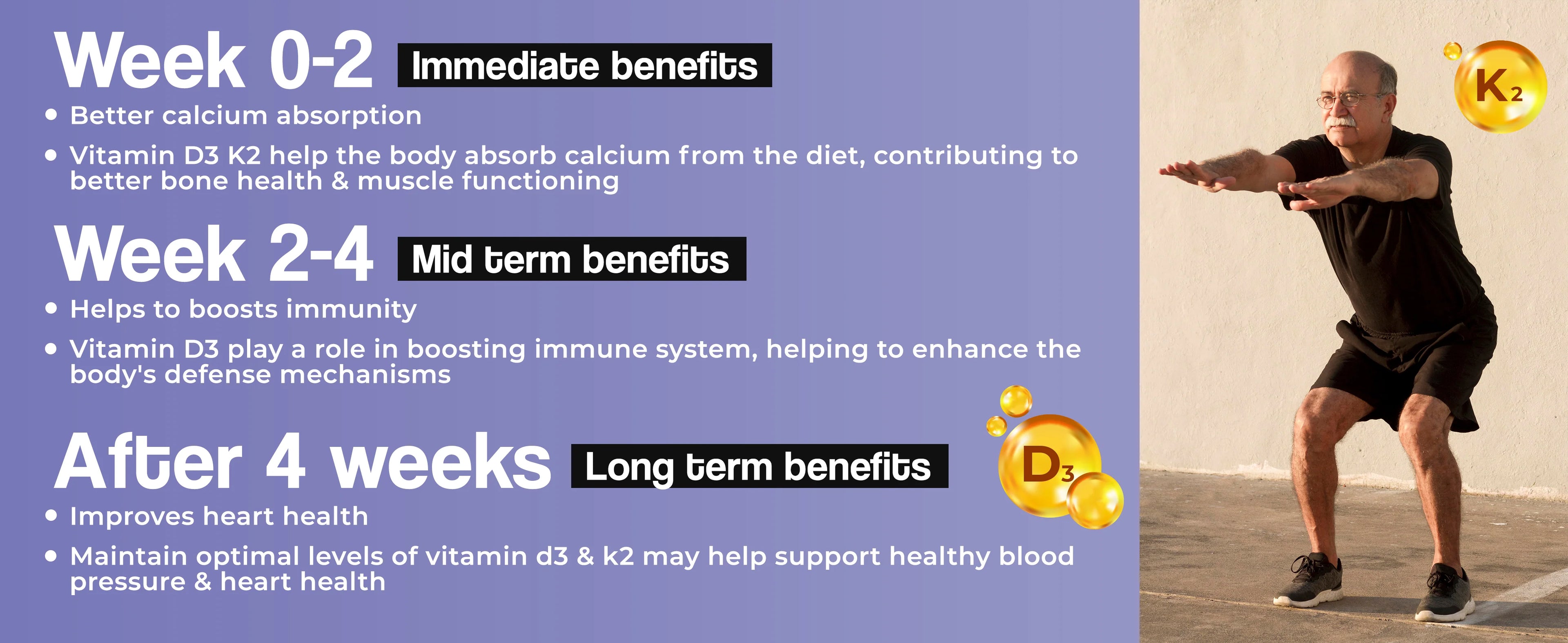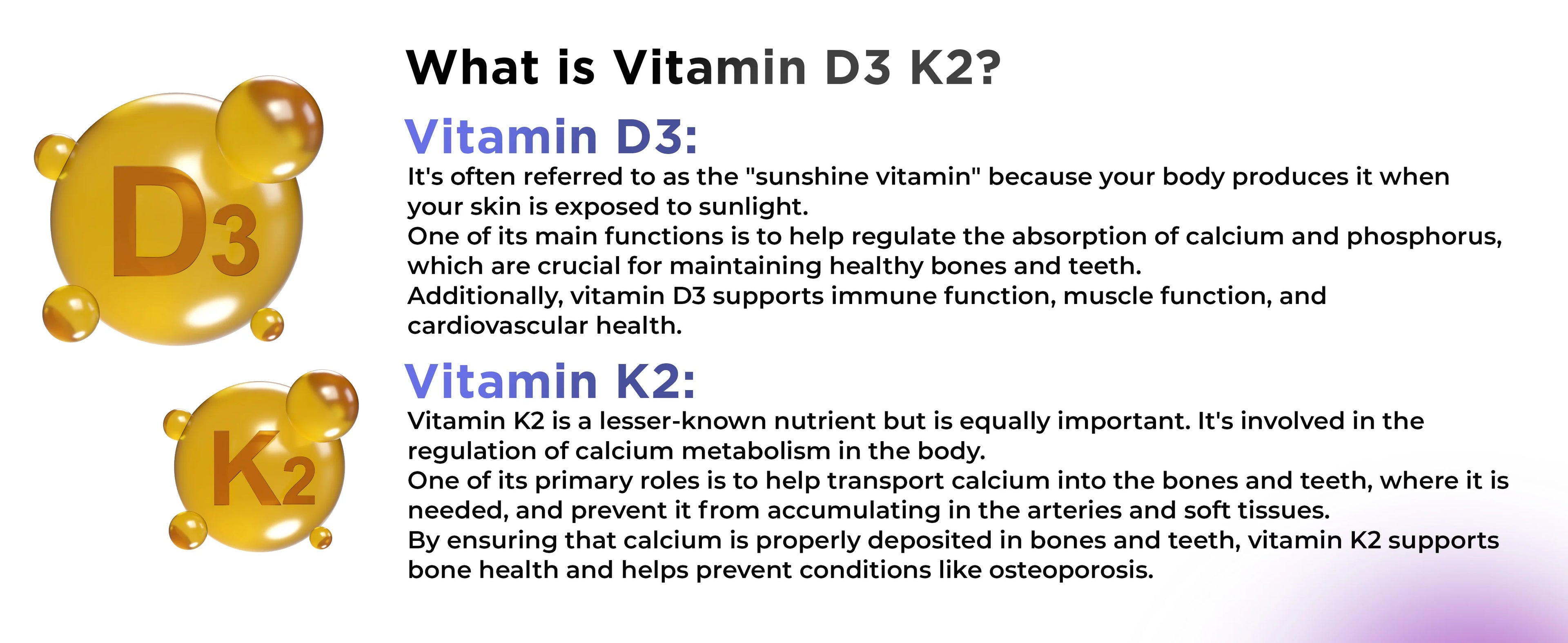 • HEALTHY HEART & MUSCLE STRENGTH: Vitamin D3 benefits skeletal muscle development and optimizes muscle strength. It also shows anticoagulant and anti-atherosclerosis effects improve cardiovascular function. Moreover, vitamin K2 is a crucial vitamin for healthy heart functioning.